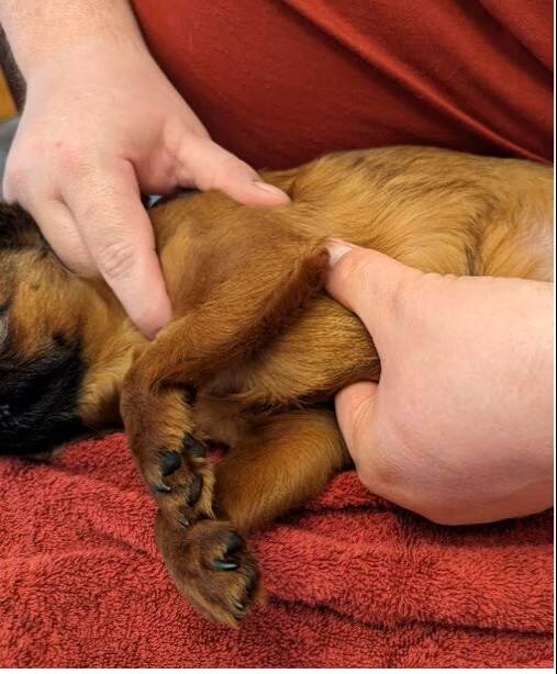 Leg je hand voorzichtig op de borstkas, net achter de punt van de elleboog (als de hond zou staan).