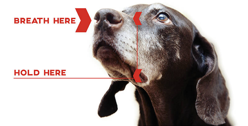 Maak met je mond een afsluiting rond de neusgaten (bij kleine honden mag je ook neus en mond tegelijk bedekken)